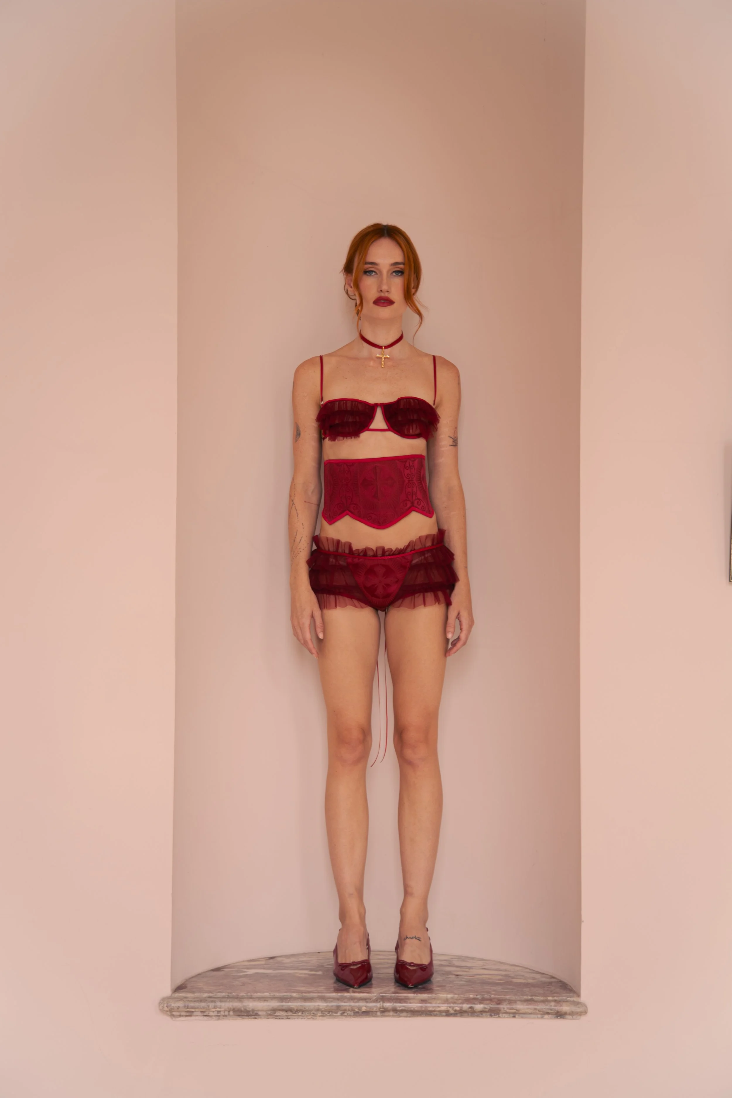 Combining lustrous deep burgundy Liturgical Brocade with carefully considered crucifix cut-outs and sheer tulle ruffles, it creates an alluring, playful silhouette.