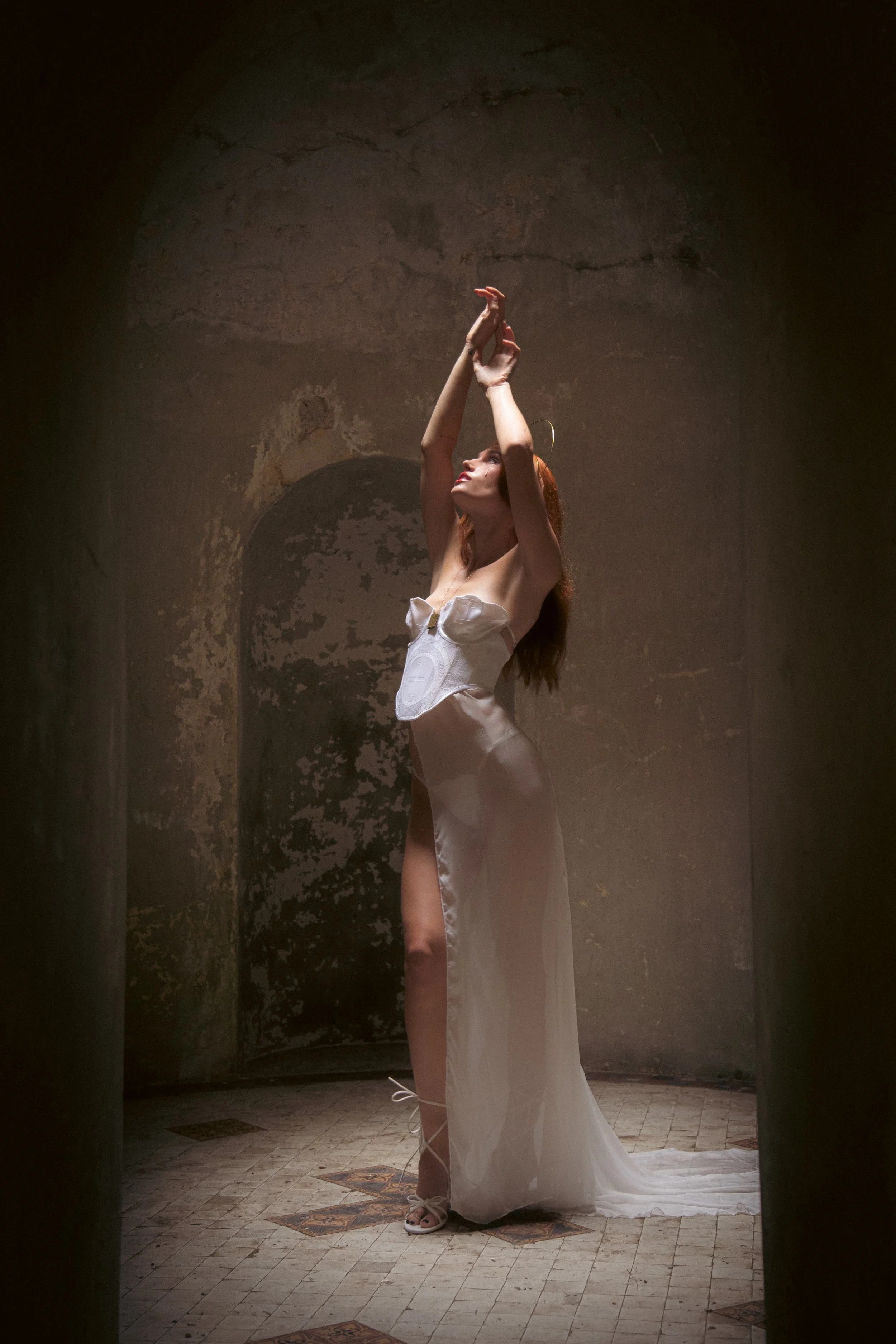 Tansforming optic white Liturgical Brocade into dome-inspired contoured shapes, combined with draped silk chiffon, the look creates a sophisticated silhouette. Simultaneously offering interchangability between lingerie & womesnwear.