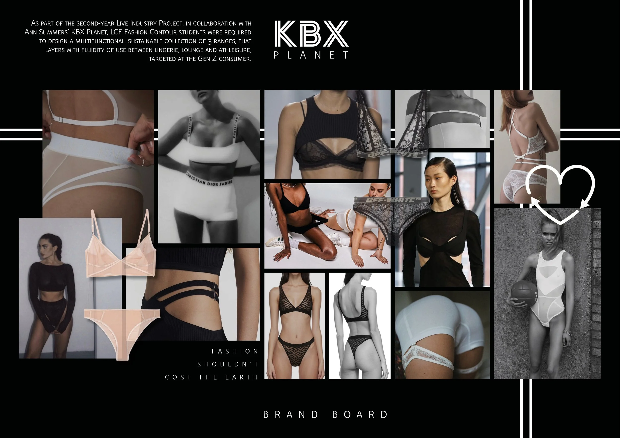 Within this second-year Live Industry Project, in collaboration with Ann Summers' KBX Planet, LCF Fashion Contour students were required to design a multifunctional, sustainable collection of 3 ranges, that layers with fluidity of use between lingerie, lounge, and athleisure, targeted at the Gen Z consumer.